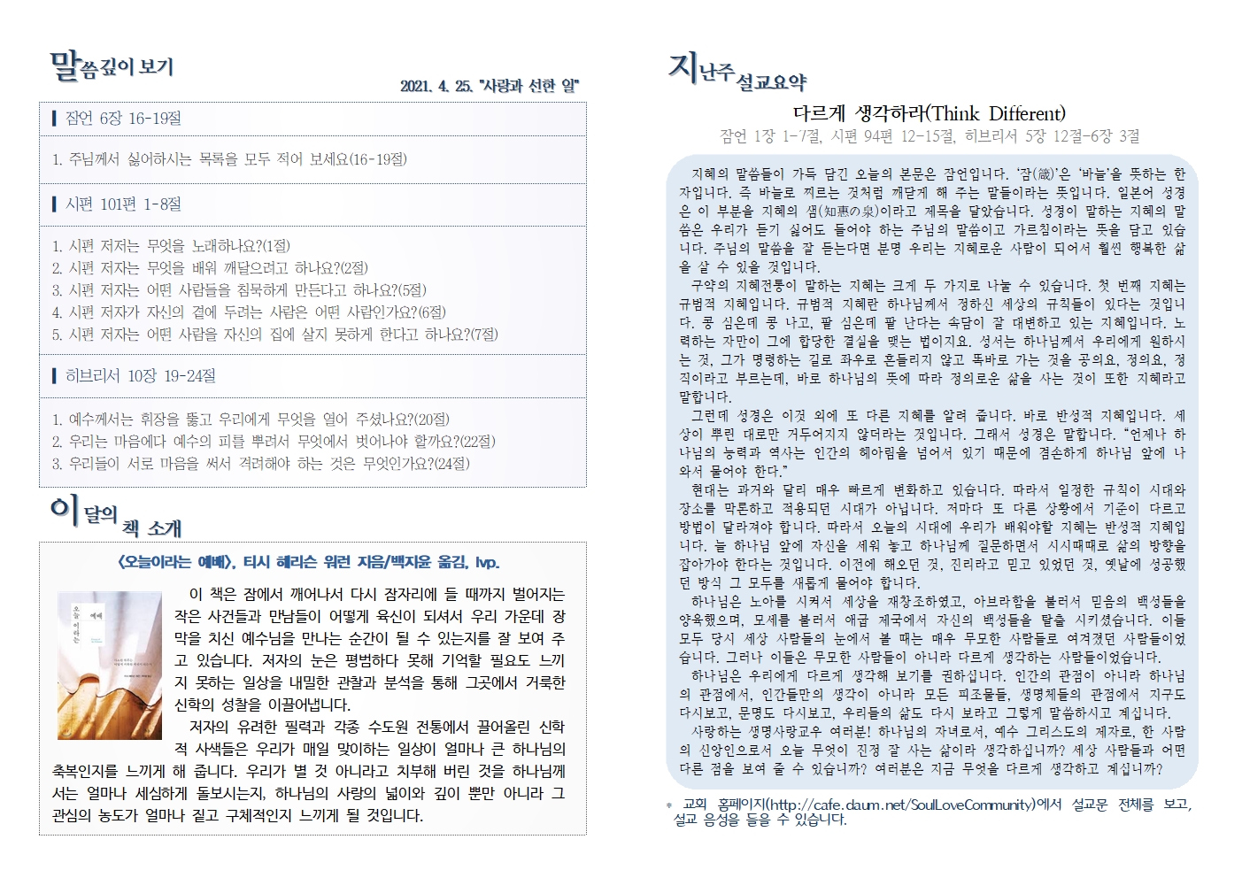 2021.4.25. 주보 2021.4.25. 주보 [PDF 다운로드] agapao-zoe church2021-04-24T22:07:47+09:00 이글을 SNS로 공유하기! FacebookTwitterRedditLinkedInWhatsAppTumblrPinterestVk이메일