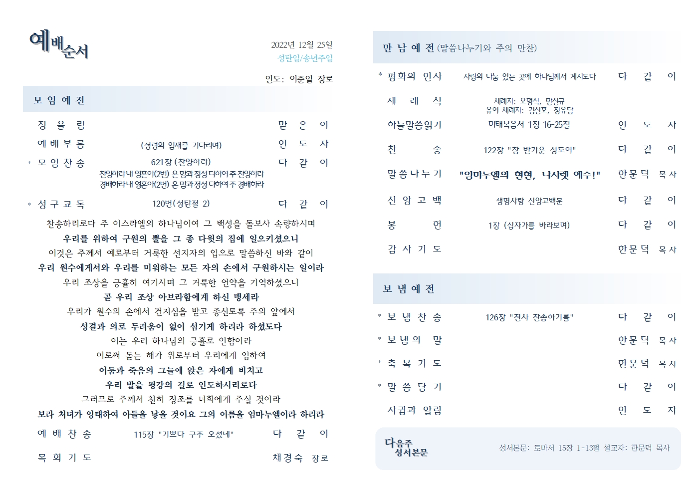 2022.12.25. 주보 2022.12.25. 주보 [PDF 다운로드] agapao-zoe church2022-12-24T21:13:18+09:00 이글을 SNS로 공유하기! FacebookTwitterRedditLinkedInWhatsAppTumblrPinterestVk이메일